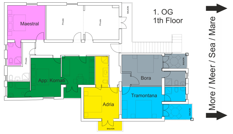 Zimmer "Maestral"Ausstattung:DoppelbettBad/ Dusche, WCBalkon mit GartenmöbelnSat-TV Nichtraucherzimmer